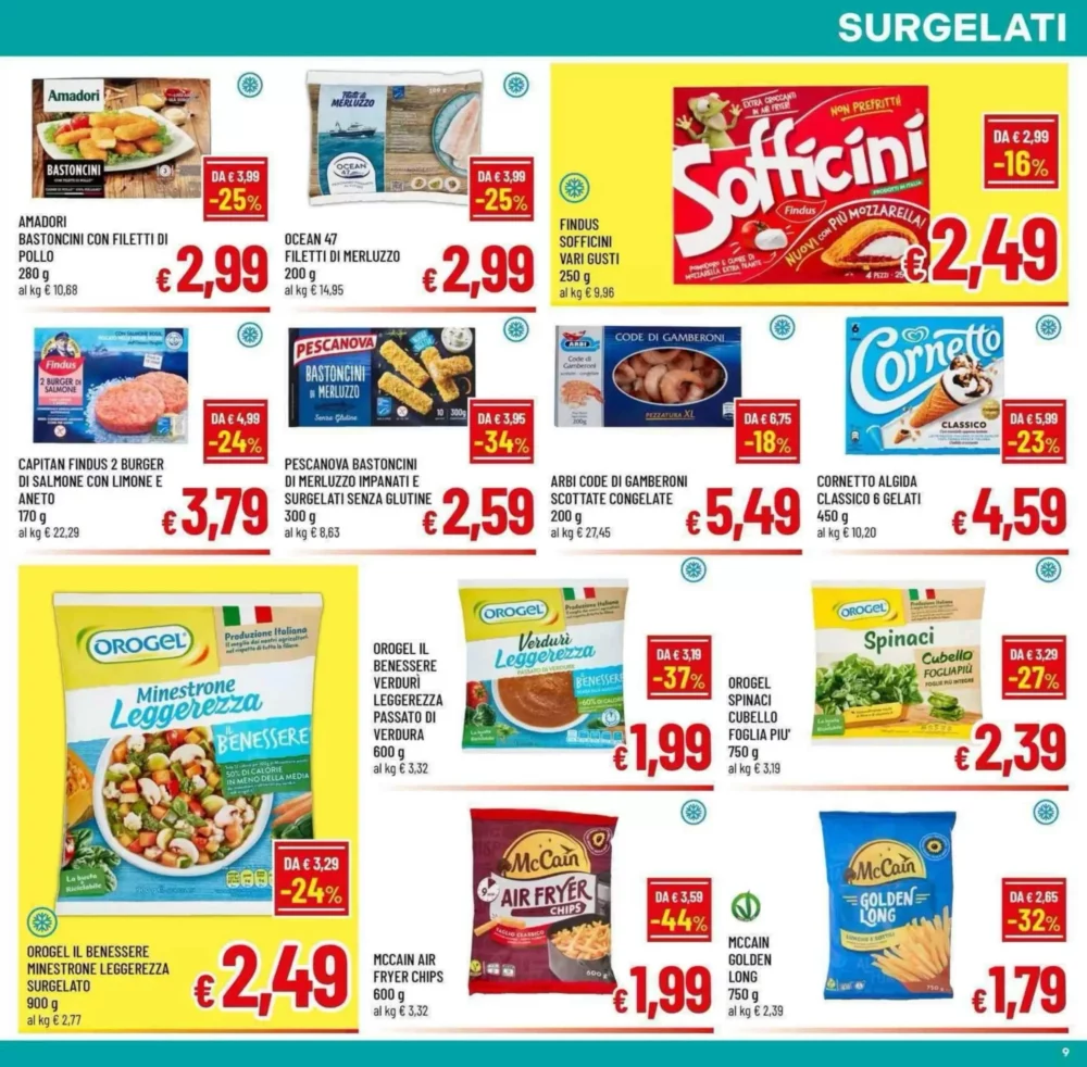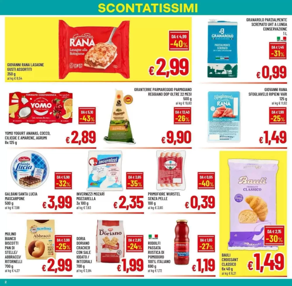 Il volantino propone Primofiore Wurstel Senza Pelle a 0.39€, ottimi per snack veloci. Le Braciole di suino sono in offerta a 0.49€ l’etto, mentre la Lonza di suino a fette arriva a 0.78€. Per chi ama la carne intera, il Coniglio intero è disponibile a 0.79€, e il Coati Prosciutto Cotto Royale a 0.89€.