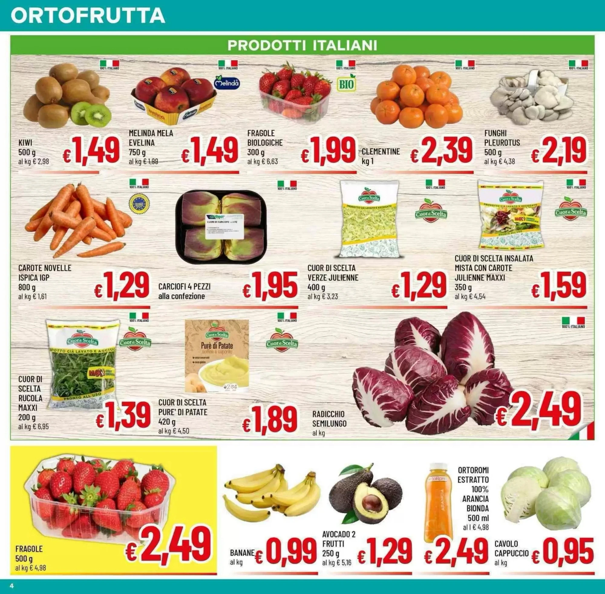 Il volantino propone Primofiore Wurstel Senza Pelle a 0.39€, ottimi per snack veloci. Le Braciole di suino sono in offerta a 0.49€ l’etto, mentre la Lonza di suino a fette arriva a 0.78€. Per chi ama la carne intera, il Coniglio intero è disponibile a 0.79€, e il Coati Prosciutto Cotto Royale a 0.89€.