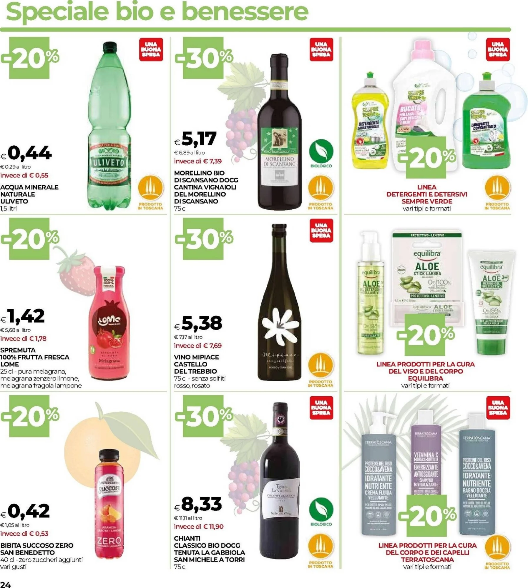 Nel volantino Coop trovate offerte vantaggiose per le bevande, come l’Acqua minerale Uliveto 1,5 litri a soli 0.44€ e la Bibita Succoso Zero San Benedetto 40 cl a 0.42€. Ideali per rinfrescarsi senza spendere troppo.