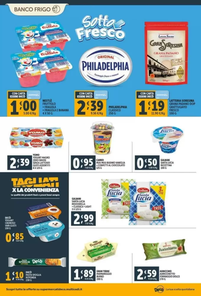 Tra i prodotti lattiero-caseari troviamo Yogurt vari gusti Muller a soli 0.59€, ideale per una colazione leggera. Anche Decò Yogurt Cremoso Vari Gusti è in offerta a 0.85€, perfetto per chi ama la cremosità. Non dimenticare la Galbani Santa Lucia Ricottina a 0.5€, ottima per snack veloci.