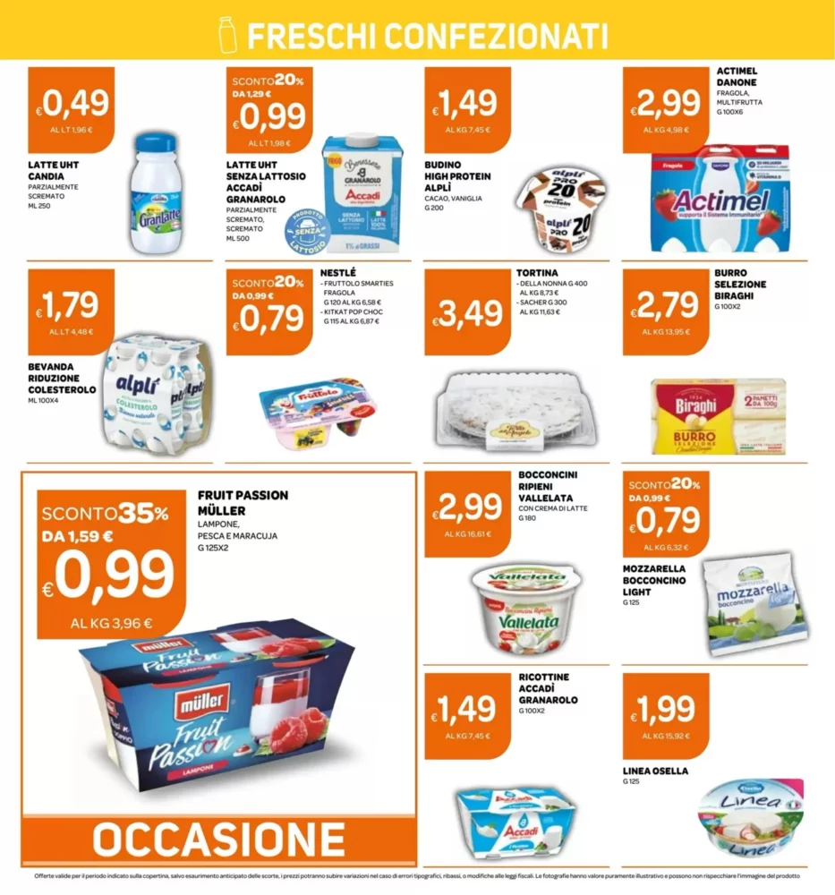 I prodotti lattiero‑caseari sono tra i più convenienti: il Latte UHT Candia è disponibile a 0.49€, la Mozzarella Bocconcino Light a 0.79€ e la Gran Ricotta Super Cremosa Biraghi a 0.99€. Perfetti per colazioni, snack o ricette veloci.