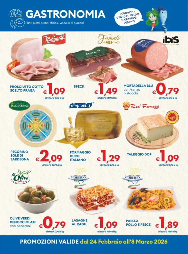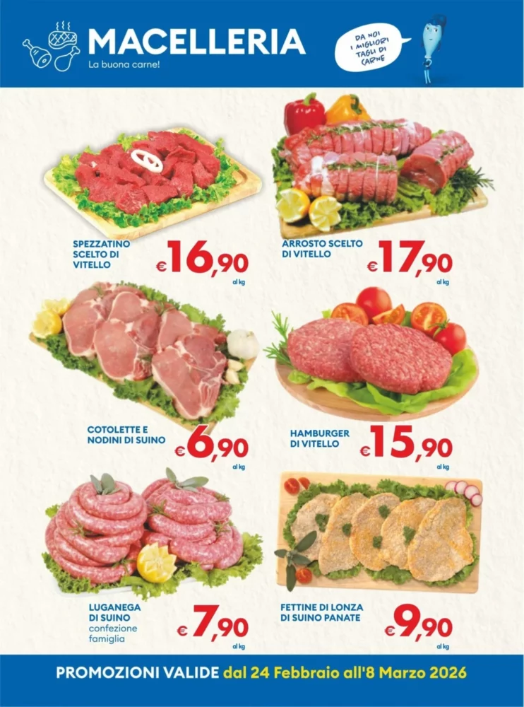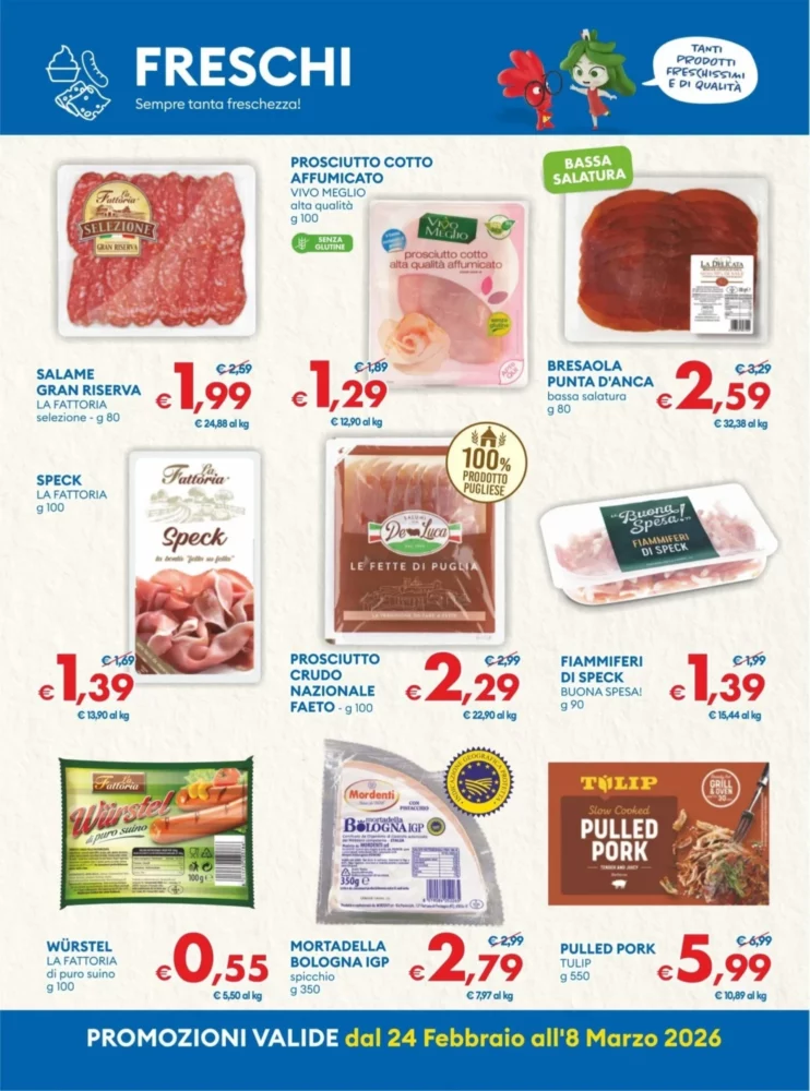 Per chi ama i salumi, il volantino propone Würstel La Fattoria – 0.55€, un prodotto di puro suino ideale per grigliate veloci. Anche la Mortadella blu all’etto – 0.79€ è in offerta, perfetta per tramezzini. Valuta le quantità per evitare sprechi e abbina a pane fresco per un pasto completo.