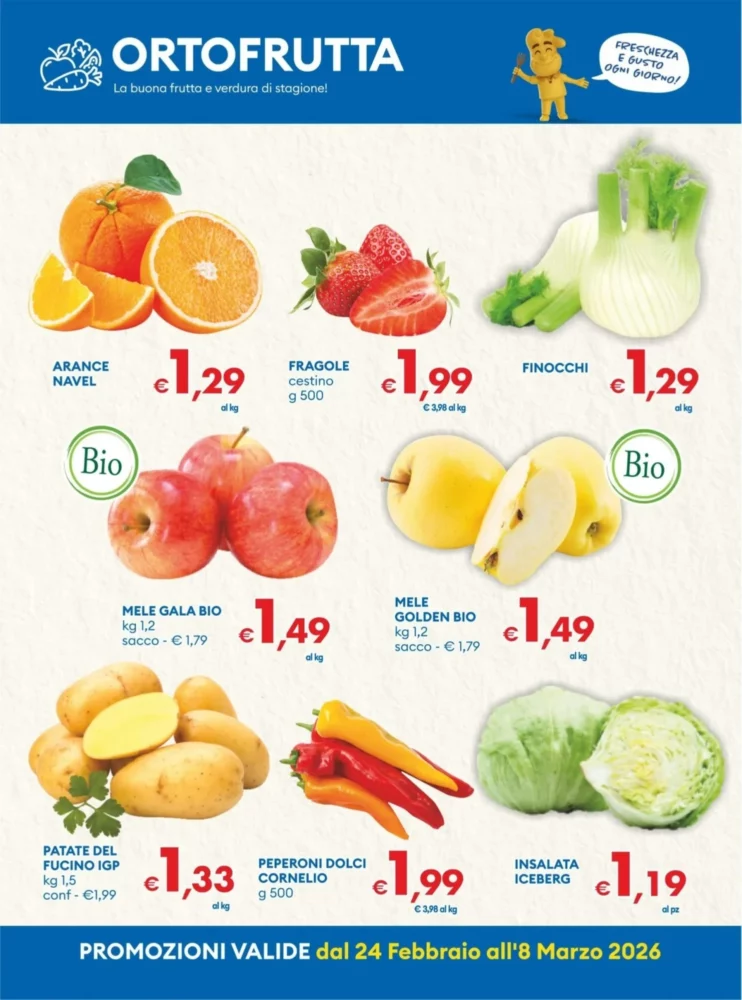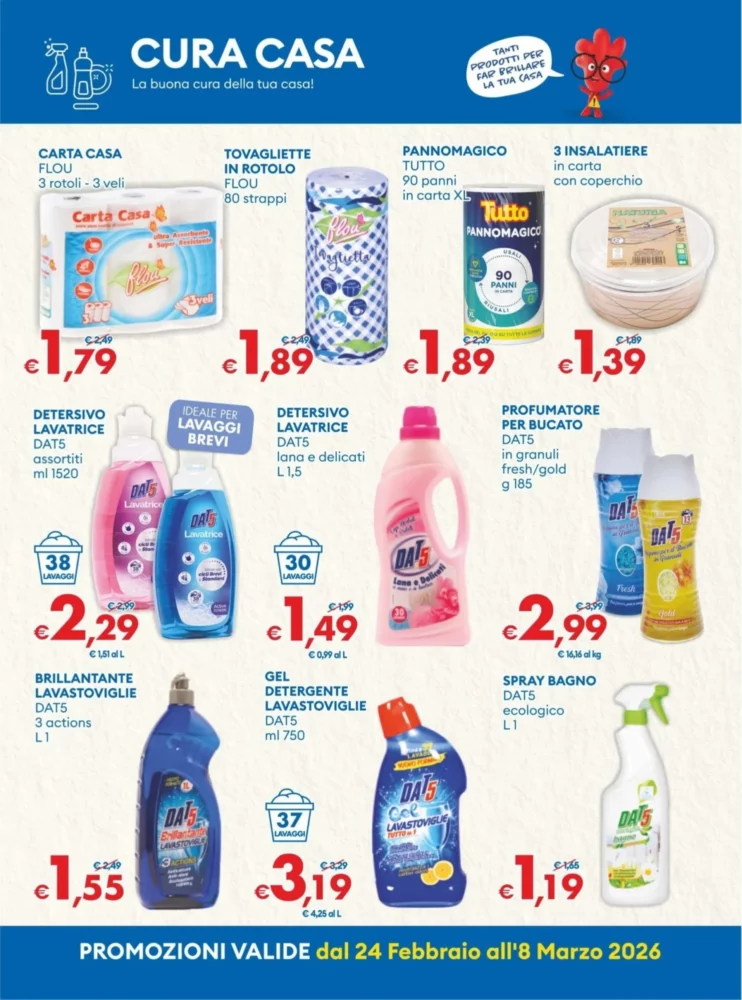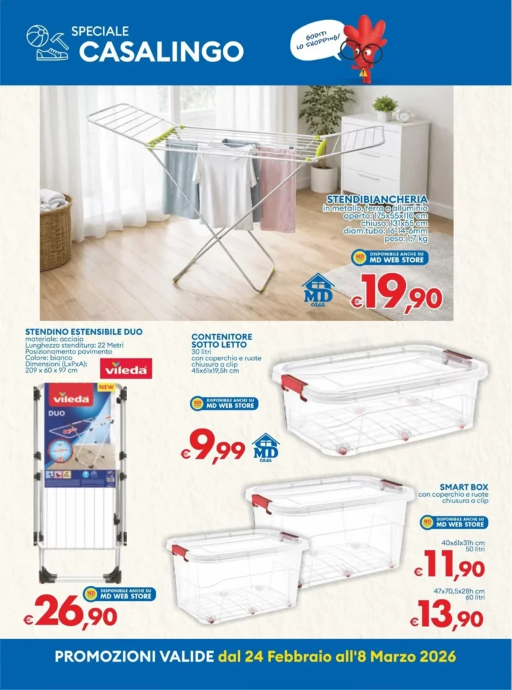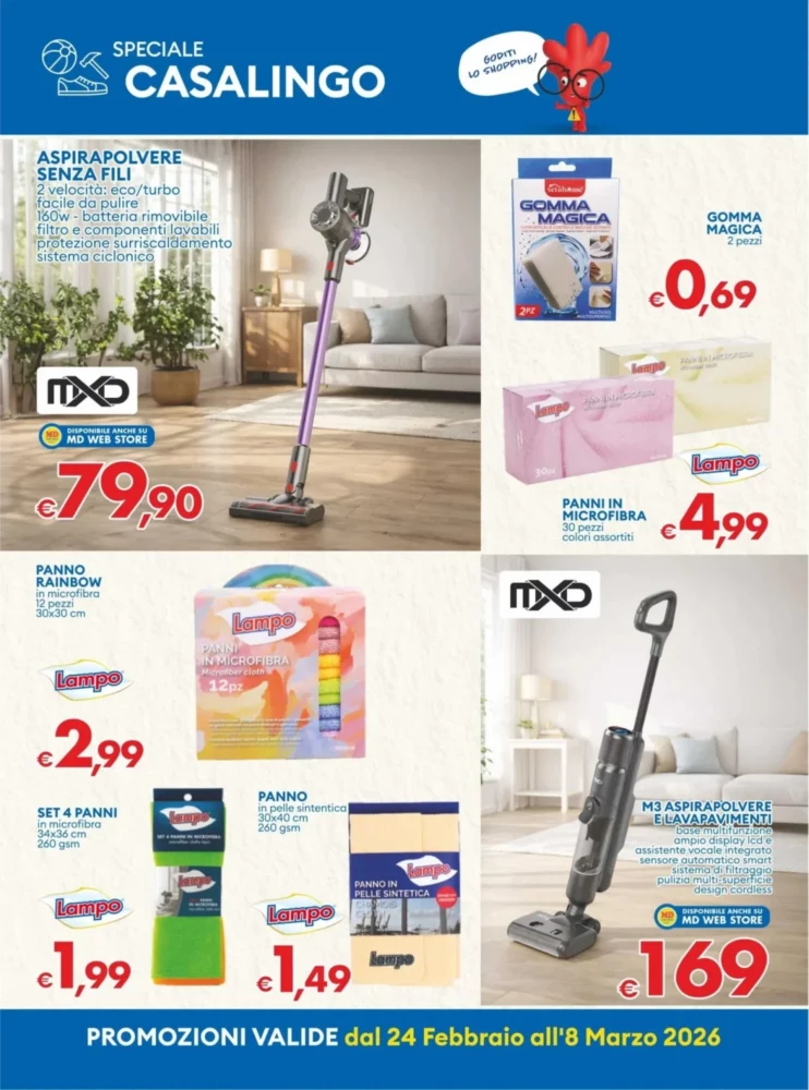 Il volantino MD è valido dal 24 Febbraio 2026 al 8 Marzo 2026 e propone un totale di 218 offerte in tutta Italia. Troverai prodotti di uso quotidiano a prezzi stracciati, perfetti per fare la spesa senza sforare il budget.