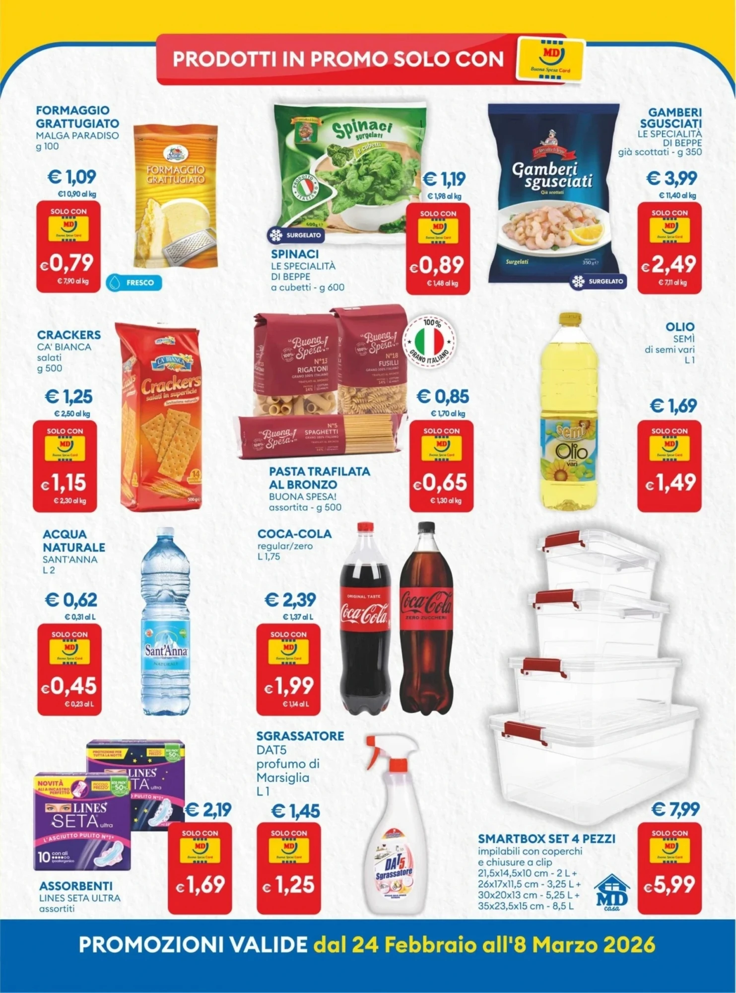 Il volantino MD è valido dal 24 Febbraio 2026 al 8 Marzo 2026 e propone un totale di 218 offerte in tutta Italia. Troverai prodotti di uso quotidiano a prezzi stracciati, perfetti per fare la spesa senza sforare il budget.