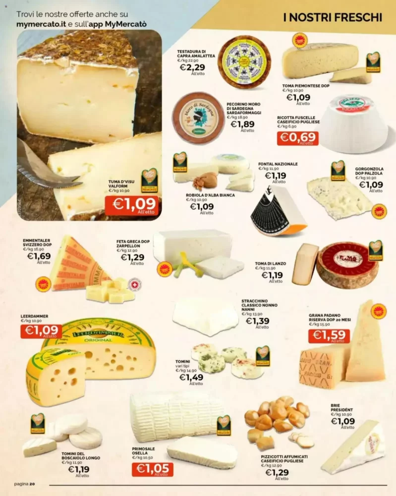 Nel reparto latticini troviamo prodotti di buona qualità a prezzi imbattibili. Il Yogurt Vipiteno è disponibile a 0.65€, mentre la Ricotta fuscelle caseificio Pugliese costa 0.69€, perfetti per colazioni e ricette.