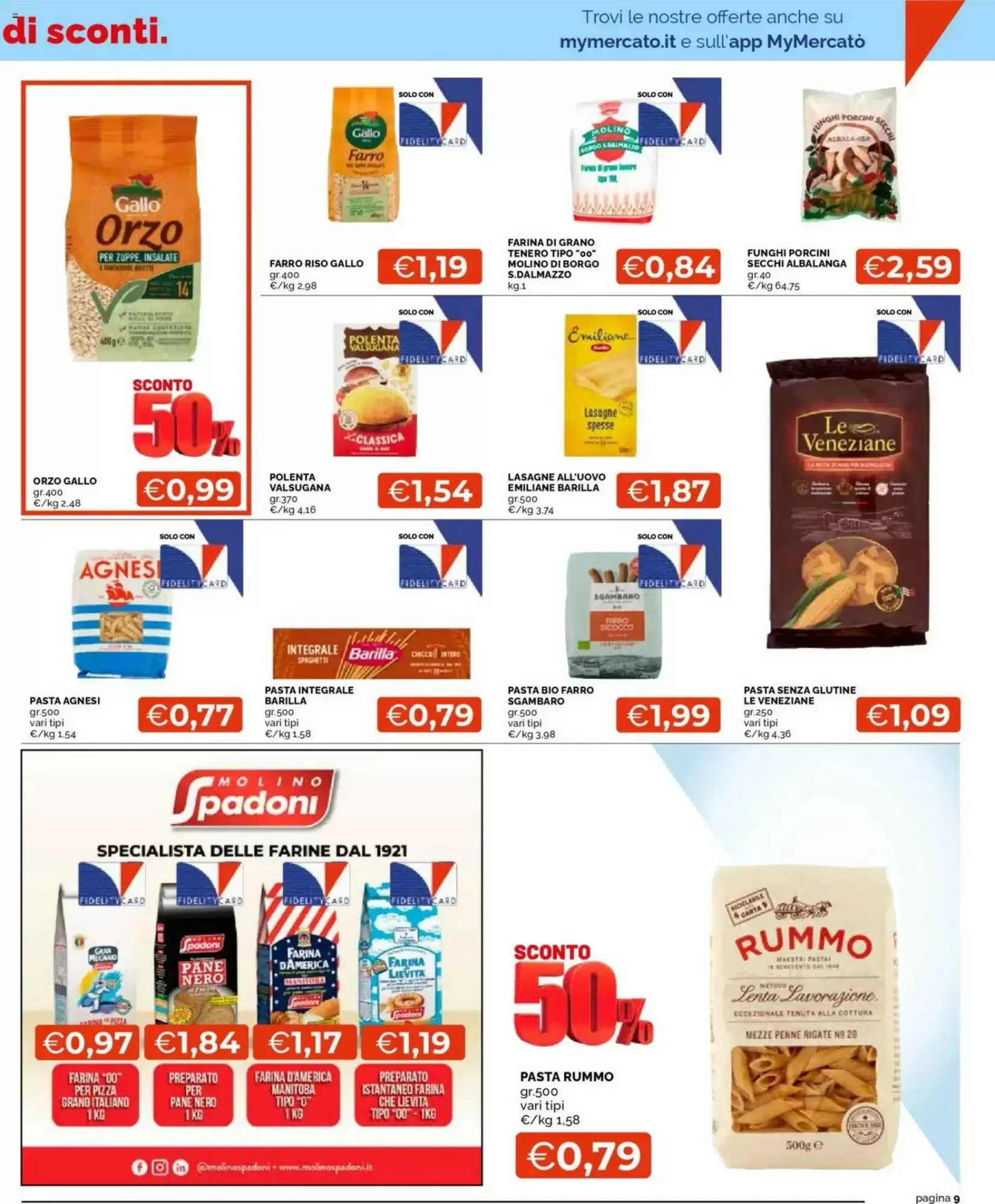 Per la dispensa, le offerte includono Orecchiette fresche Maffei a 0.55€, Grissini Nostrani Panealba a 0.69€ e il Grissino Iposodico è Senza Monviso a 0.74€, ottime scelte per pasti veloci.