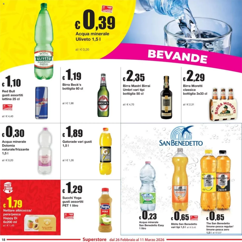 Il volantino propone offerte vantaggiose su acque minerali e bibite. Troviamo Acqua minerale San Benedetto Easy 1 litro a soli 0.23€, Acqua minerale Dolomia 1,5 l a 0.3€ e Acqua minerale Uliveto 1,5 l a 0.39€. Per chi cerca qualcosa di diverso, il The San Benedetto limone-pesca regular/1,5 l è disponibile a 0.85€.
